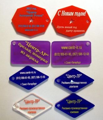 Брелки оптом. Двухсторонние брелки из цветного акрила. Минимальная партия 100 штук. Срок изготовление от двух до четырех дней. В стоимость брелков входит материал, отрисовка формы брелка, гравировка рисунка с последующей покраской, колечко. Действуют гибкие объемные скидки. Осуществляем доставку по России и г. Санкт-Петербург.