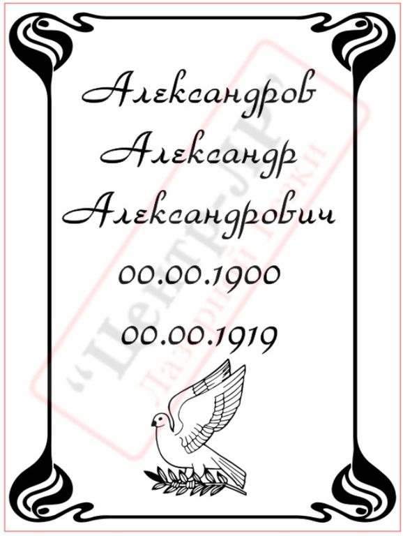 Ритуальная табличка М4 изготавливается из пластика или алюминия для установки на крест, памятник. Информация наносится гравировкой или печатью. Срок изготовления 2-4 часа для пластика и 12 часов для алюминия.