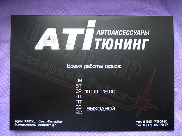 "Товарный раздел № Т9"- для расчета стоимости табличек на дверь, офис из материала двухслойный пластик. Технология изготовления - лазерная гравировка.