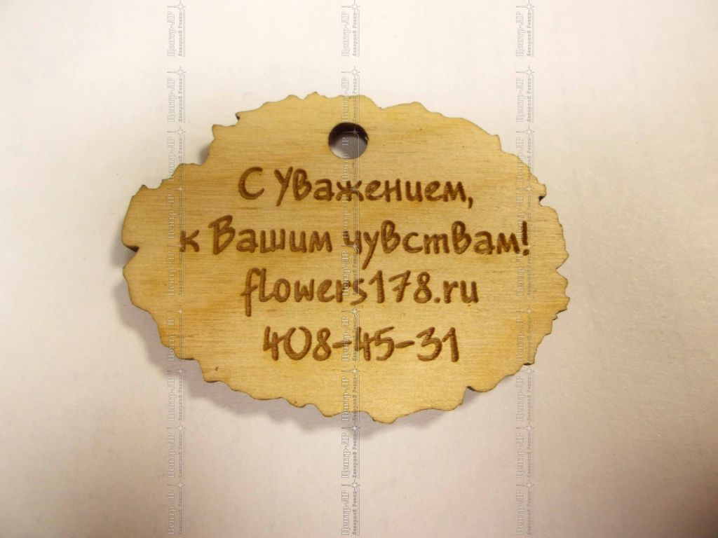Брелок из березовой фанеры. Лазерная гравировка рисунка. Нанесение изображения с одной стороны. Форма брелка вырезается по требованиям заказчика. Срок изготовления 1-2 дня. Брелки комплектуются колечком для ключей и покрываются бесцветным защитным покрытием.
