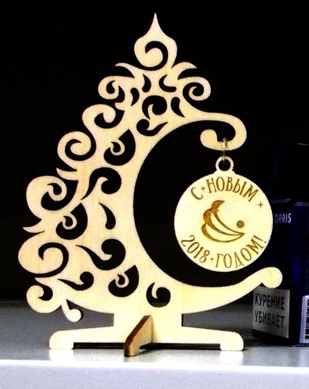 Сувенир представляет собой ёлочку оригинального дизайна. Предназначен для установки на стол, но при желании им можно украсить хвойные ветки. Изготовлен сувенир из натуральной древесины с использованием лазера, а потому стала возможной высокая детализация и чрезвычайно тонкая работа, что вызывает неподдельное восхищение у обладателей.
