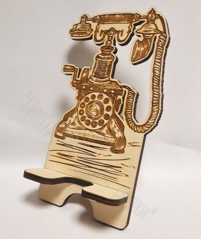 Подставка для телефона, смартфона- "Телефон" Изготовлена из 6мм фанеры, нанесена гравировка телефонного аппарата начала 20 века. Состоит из двух частей. Размеры (в.ш.д) 21,5*10*10 см. Упаковка - пакет.