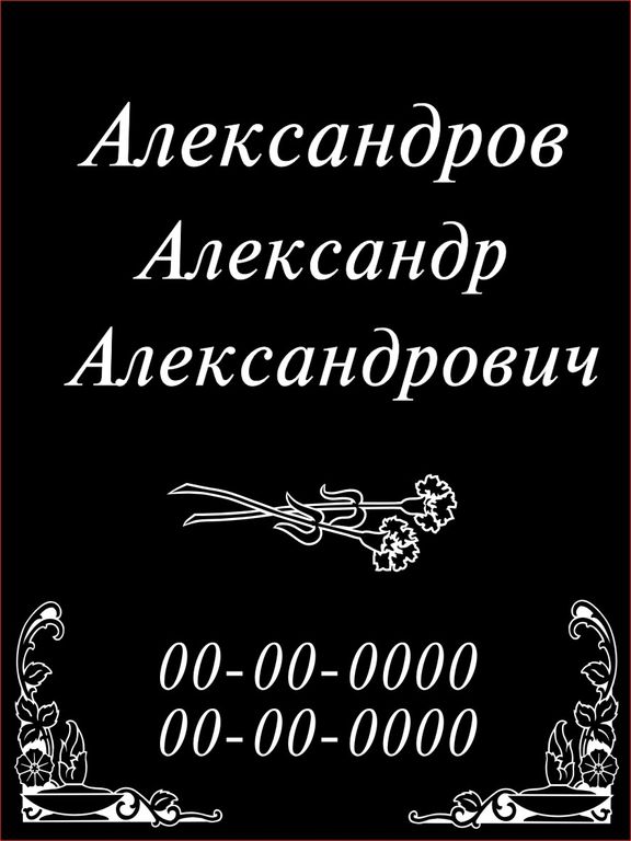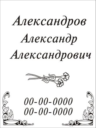 Ритуальная табличка изготавливается из пластика или алюминия для установки на крест, памятник. Информация наносится гравировкой или печатью. Срок изготовления 2-4 часа для пластика и 12 часов для алюминия.