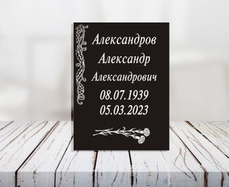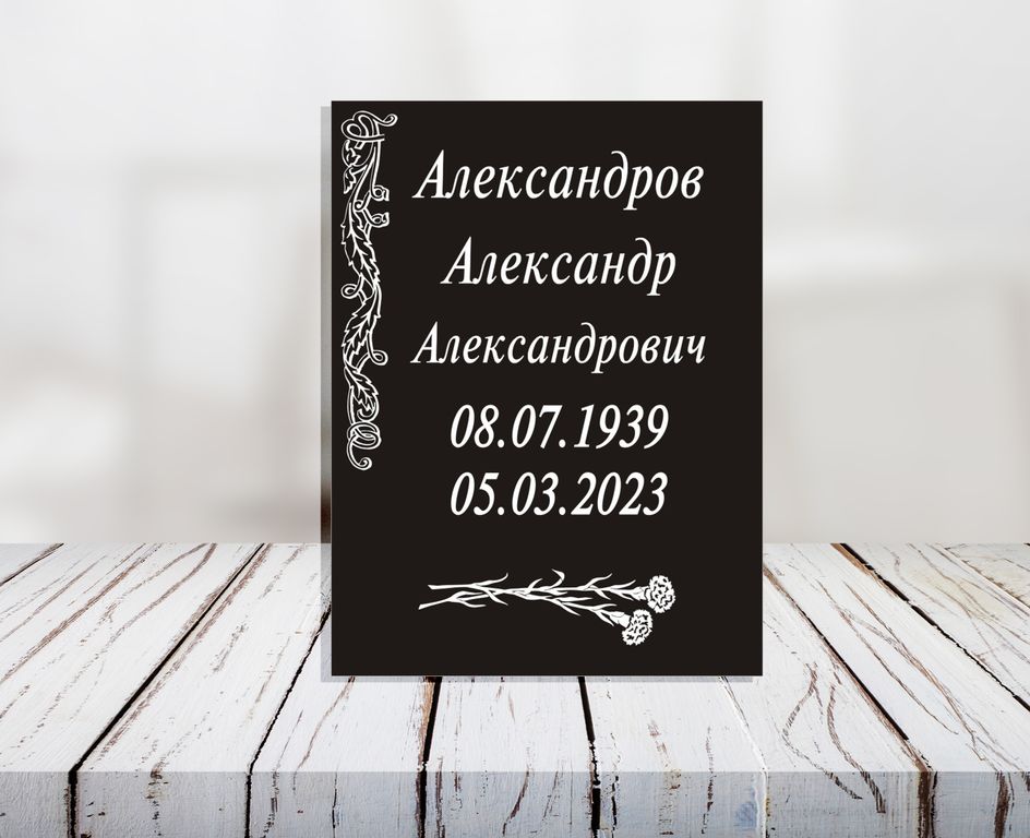 Ритуальная табличка М4 изготавливается из пластика или алюминия для установки на крест, памятник. Информация наносится гравировкой или печатью. Срок изготовления 2-4 часа для пластика и 12 часов для алюминия.
