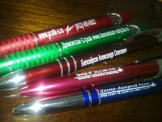 Производим нанесение гравировки авторучки и карандаши. Оборудование, используемое нашей организацией позволяет наносит гравировку не только по длине изделия, но и по кругу. Такое нанесение не только сделает вашу покупку оригинальной, но и позволит разместить больше информации. Наша компания работает с частными и юридическими лицами. Минимальный заказ на гравировку 1 штука.